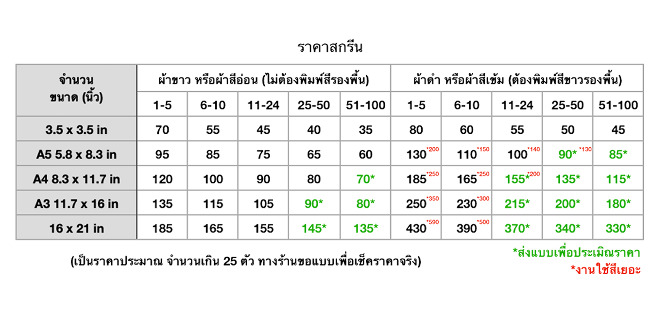 FrogsDTG ราคาประเมินจากการใช้น้ำหมึกในการสกรีน และอิงจากในตารางทั้งสองตารางนี้
